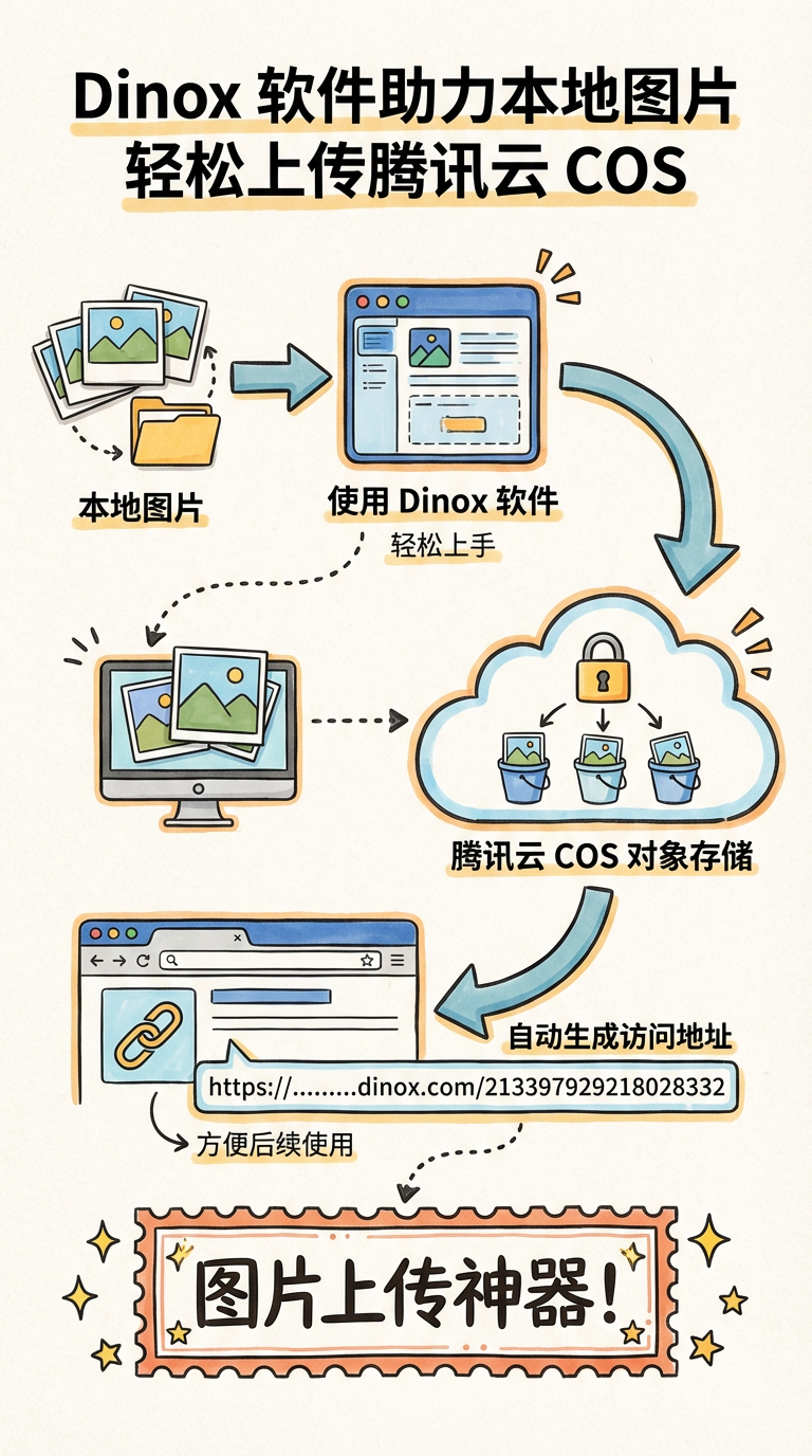8.4.20260101 Dinox 软件助力本地图片轻松上传腾讯云 COS Dinox 软件助力本地图片轻松上传腾讯云 COS¶ #dinox 可以使用 Dinox 这款软件,将本地图片上传到自己的腾讯云 COS 对象存储上。它会自动生成一个访问地址,方便后续使用。这可以说是一款图片上传神器。 #日记记录
