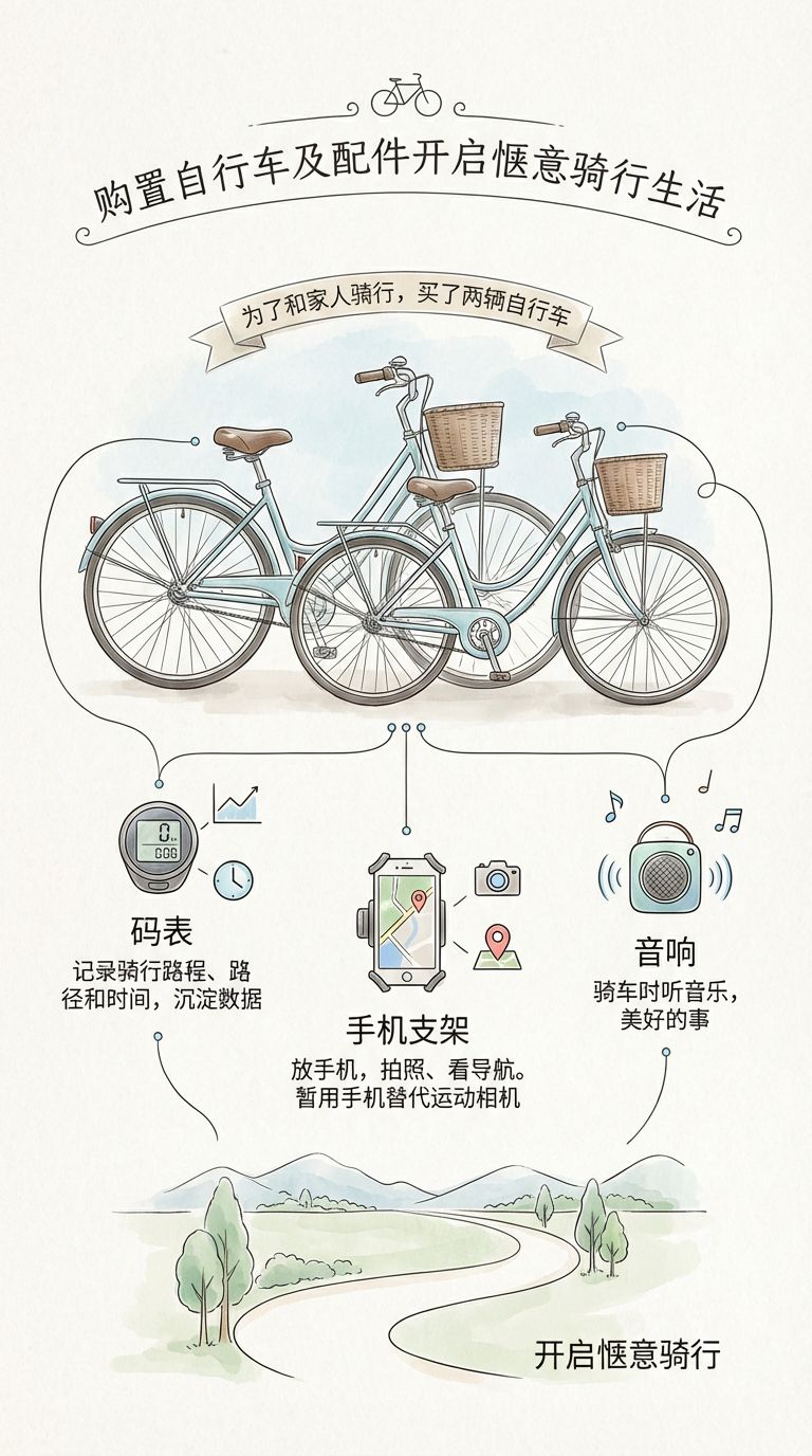 8.4.20260103 购置自行车及配件开启惬意骑行生活 购置自行车及配件开启惬意骑行生活¶ 为了和家人骑行,买了两辆自行车。有了车之后,添置了一个码表,用来记录骑行的路程、路径和时间,方便沉淀数据。还买了一个手机支架,用来放手机。骑车时,有时会拍照,也可能看导航。本来想买一个运动相机,但后来算了算,还是先用手机解决。再配一个音响,骑车时听音乐是件很美好的事。 #日记记录 #攻略 #骑行